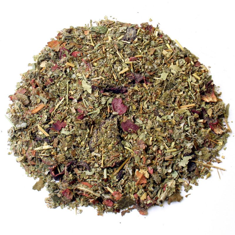 Marjolaine, Achillée millefeuille, Alchémille, Framboisier, Sauge officinale, Vigne rouge, Sophora, Hibiscus, poudre d'Orange douce, HE Orange douce