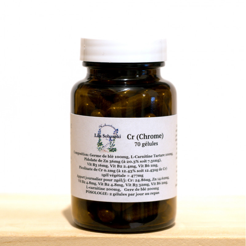 Germe de blé 100mg, L-Carnitine tartare 100mg, Pidolate de Zn 36mg (à 20,3% soit 7,31mg), Vit B3 16mg, Vit B2 2,4mg, Vit B6 1mg, Picolinate de Cr 0,1mg (à 12,43% soit 12.43ug de Cr) Pour une gélule végétale de 477mg