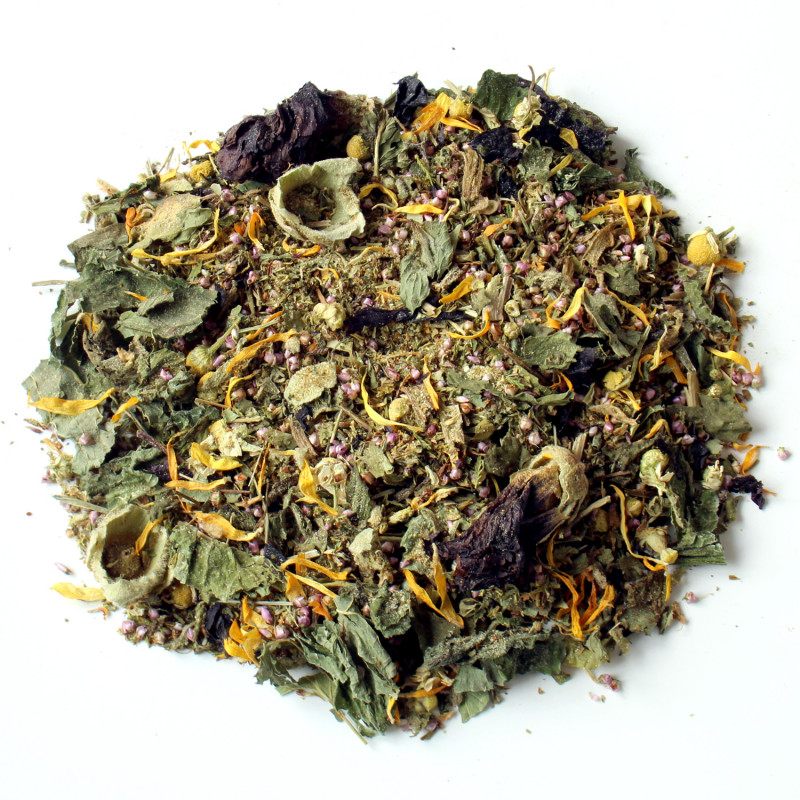 Mauve, Lamier, Menthe poivrée, Mélisse, Bruyère, Souci, Matricaire, Millefeuille, Millepertuis, Poudre d'Orange